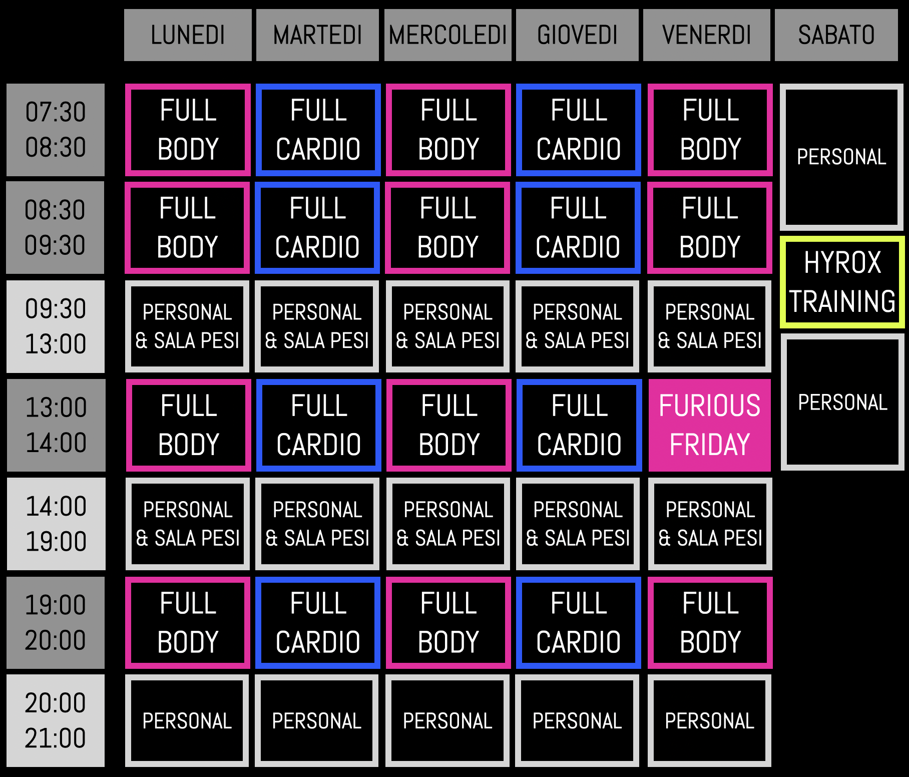 LE NOSTRE SESSIONI CARDIO USANO SCATTI, RIPETUTE E INTERVALLI, PER SVILUPPARE RESISTENZA E CAPACITÀ AEROBICA, AUMENTANDO L’EFFICIENZA DEI TUOI SISTEMI ENERGETICI E AIUTANDOTI A MUOVERTI MEGLIO, PIÙ VELOCE E PIÙ POTENTE.